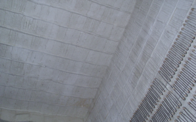 另一類是陶纖噴涂料或澆注料(背襯)+陶纖模塊(熱面);此類結(jié)構(gòu)具有較高的綜合性能,可充分避免煙氣對錨固件的腐蝕,效果等同于阻氣金屬箔。