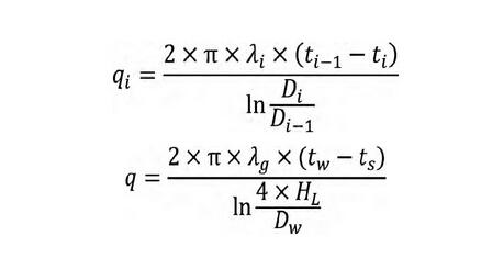 式中, q為單位長度熱損失, W/m;qi為通過第i層保溫材料單位長度的熱損失, W/m;λi為第i層保溫材料在平均溫度下的導(dǎo)熱系數(shù), W/ (m·k) ;λg為當(dāng)量埋深處土壤的導(dǎo)熱系數(shù), W/ (m·k) ;ti為第i層材料外表面溫度, ℃;ti-1為第i-1層材料外表面溫度, ℃;tw為保溫管外表面溫度, ℃;ts為管中心深處土壤溫度, ℃;Di為第i層材料保溫外徑, m;Di-1為第i-1層材料保溫外徑, m;Dw為較外層保溫層外徑, m;HL為管道當(dāng)量埋深, m;當(dāng);H為管中心埋深, m;H=較小覆土深度+0.5 Dw。