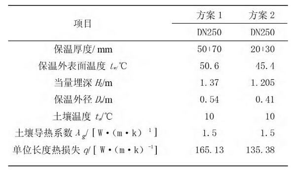計算的蒸汽溫度為350℃, 管道選用DN250管, 滿足管道表面溫度小于50℃, 滿足兩種保溫材料層間溫度≤280℃ (規(guī)范規(guī)定[5]:玻璃棉較高溫度為350℃, 這里取0.8的安全系數(shù)) 。根據(jù)CJJ/T104-2014《城鎮(zhèn)供熱直埋蒸汽管道技術(shù)規(guī)程》中對不同管徑下較小覆土深度要求, 蒸汽管中心深處土壤溫度取為10℃, 土壤導(dǎo)熱系數(shù)為1.5 W/ (m·k) 。計算保溫厚度及熱損失量。方案1:硅酸鋁+玻璃棉;方案2:納米氣凝膠氈+玻璃棉。保溫厚度及熱損失量見表1。