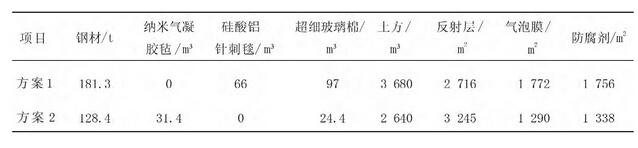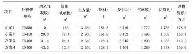2) 但是, 在3層采用納米氣凝膠氈氈材料時的工程總投資為159.6萬元, 對比方案3和方案4不難發(fā)現(xiàn), 納米氣凝膠氈氈使用量增加時外護鋼管規(guī)格并沒有發(fā)生改變, 鋼材使用量、土方量、氣泡膜使用量、防腐面積等均不變, 而反射層的使用量反而增加了, 造成工程總投資增加。