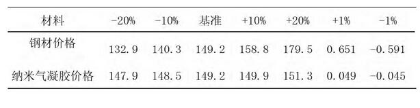 考慮到納米氣凝膠氈的價格和鋼材價格是對蒸汽管直埋總投資影響較大的兩個關(guān)鍵因素, 現(xiàn)分析這兩種材料價格對總投資的敏感性, 敏感性分析見表4。