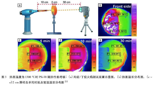 在復(fù)合氣凝膠研究方面,主要包括兩種策略:一種是在Si02氣凝膠中引入其他氧化物氣凝膠,形成一種二元或三元氣凝膠,抑制氣凝膠的燒結(jié)以及晶粒的長大;另外一 種就是與有機基體復(fù)合,形成一種有機無機雜化氣凝膠, :然后經(jīng)過后續(xù)的碳化、碳熱還原等過程形成一.種Si-0-C氣凝膠材料。Hou等的通過快速凝膠法制備了纖維增強Si02 ZrO2復(fù)合氣凝膠,熱導(dǎo)率低至0.0235 W/(m.K),抗壓強度高達(dá)0.82 MPa。Wu等 制備的Al20-Si02氣凝膠(圖2)經(jīng)1200℃熱處理后比表面積高達(dá)166 m2 lg,顯著提高了Si02氣凝膠的耐溫性能。Yu等D3以酚醛樹脂作為網(wǎng)絡(luò)結(jié)構(gòu)增強體與Si02 氣凝膠進行同步聚合,制備的有機無機雜化氣凝膠(厚度20 mm)在經(jīng)過1300℃熱考核20 min后,背溫僅為300℃,同時材料正反面在30 min考核后都保持結(jié)構(gòu)完整(圖3),這對于混凝土結(jié) 構(gòu)高層建筑的防火逃生具備重大意義。趙楠等味制備的莫來石纖維增強Si-0-C氣凝膠在1000℃下的熱導(dǎo)率低至0.043 W1(m. K),同時經(jīng)1000 C熱煅燒之后沒有發(fā)生任何收縮。Assefa等 19以聚二甲硅氧烷和四甲基乙烯基環(huán)四硅氧烷為原料,經(jīng)1200℃惰性氛圍熱處理制備了Si-0-C氣凝膠,該材料比表面積為530 m21g,孔體積為0.649 cm3/g。Ma等制備的Si-0-C氣凝膠比表面積位于365 ~488 m21g,表觀密度位于0.265 ~ 0.335 g/cm ,抗壓強度較高可達(dá)3.17 MPa。