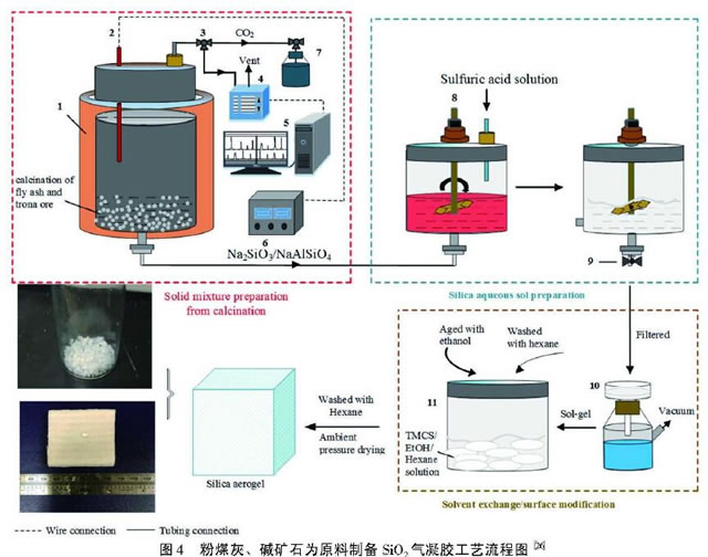 疏水SiO2氣凝膠的制備主要有3種方法:蒸汽后處理法、共前驅(qū)體法以及表面烷基化法,3種方式的核心均是將氣凝膠表面的親水基團轉(zhuǎn)化為疏水基團。其中蒸汽后處理法就是將濕凝膠置于甲醇蒸汽中,然后將其表面的Si-OH結(jié)構(gòu)轉(zhuǎn)變?yōu)镾i-0CH3結(jié)構(gòu),從而實現(xiàn)疏水改性。蒸汽后處理法一般仍采用TEOS或者TMOS作為前驅(qū)體材料,甲醇蒸汽溫度為220~ 240 C,改性時間為10~40h20。共前驅(qū)體法主要是采用含有部分不可水解基團的有機硅氧烷對常用的TEOS或者TMOS進行部分替代,進行共水解-縮聚反應(yīng),然后通過后期的很臨界干燥過程得以實現(xiàn)。由于不可水解側(cè)鏈基團的存在,采用共水解法制備的樣品一般具備更低的密度、較差的透明度,而疏水性能顯著提升。較常見的共水解劑包括甲基三甲氧基硅烷、乙基三甲氧基硅烷、正丙基三甲氧基硅烷、正丁基三甲氧基硅烷、乙烯基三甲氧基硅烷等。Li等以 正丙基三乙氧基硅烷為共水解劑,經(jīng)常壓干燥制備了接觸角高達(dá)153的疏水氣凝膠,同時該氣凝膠的彈性模量顯著提升(0.21 MPa到0.35 MPa)。Yu等2也采用共前驅(qū)體法結(jié)合CO2很臨界干燥對于疏水SiO2氣凝膠進行了研究,該氣凝膠接觸角為152,疏水溫度達(dá)450 C。表面烷基化法就是采用三甲基氯硅烷(TMCS)、六甲基二硅 氮烷(HDMS)等疏水改性劑,對于濕凝膠進行表面改性,將其表面的Si-0H轉(zhuǎn)化為疏水的0Si-CH結(jié)構(gòu)。Jeong等嗎以TEOS為硅源,其濕凝膠經(jīng)TMCS疏水改性后,制備的氣凝膠接觸角高達(dá)143%。其他研究人員D4對于TEOS形成的濕凝膠結(jié)構(gòu)采用HDMS進行疏水改性。2.3低成本Si02氣凝膠 低成本制備改性Si02氣凝膠材料主要從兩方面入手,一是采用價格低廉的水玻璃、粉煤灰、稻殼灰、礦渣等原料替代價格高昂的有機金屬醇鹽;二是采用低成本的常壓干燥技術(shù)取代很臨界干燥技術(shù)。由于常壓干燥技術(shù)中往往需要引入疏水改性劑,因此在這一過程中同時也實現(xiàn)了對SiO2氣凝膠的疏水改性。Cheng 等 23以粉煤灰為原料,采用堿激發(fā)法結(jié)合常壓干燥制備了低成本SiO2氣凝膠。該氣凝膠的密度為0.085g/cm3, 比表面積高達(dá)700m21g,接觸角為140%, 疏水溫度達(dá)360℃。Wu等 26以粉煤灰和堿礦石為原料,經(jīng)固相煅燒、酸溶、表面改性、除雜、常壓干燥等過程制備了低成本SiO2氣凝膠(圖4)。該氣凝膠的接觸角高達(dá)151°,疏水溫度可保持至476℃。Feng 等27以稻殼灰為原料,經(jīng)常壓干燥制備了低成本SiO2氣凝膠。該氣凝膠比表面積較高可達(dá) 400℃。Pan 等網(wǎng)以水玻璃為原料,經(jīng)常壓干燥在4h內(nèi)成功制備了低成本疏水Si02氣凝膠顆粒,其顆粒粒徑在20 nm左右,接觸角高達(dá)162%。