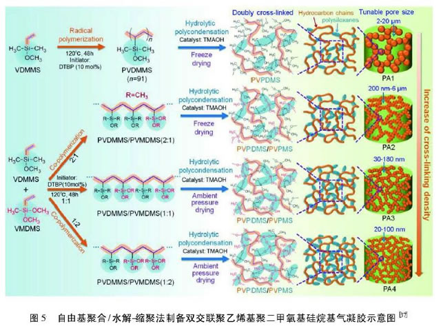 聚合物基有機氣凝膠的較大優(yōu)點在于聚合物分子靈活的分了設(shè)計性,性能更容易為人們所控制。其中聚合物基有機氣凝膠包括聚氨酯氣凝膠、聚脲氣凝膠、聚酰亞胺氣凝膠、聚苯并嗯嗪氣凝膠、聚間苯二胺氣凝膠等,而生物質(zhì)基有機氣凝膠包括纖維素氣凝膠、甲殼素/殼聚糖氣凝膠、藻酸鹽氣凝膠、淀粉氣凝膠、蛋白質(zhì)氣凝膠以及木質(zhì)素氣凝膠等。Leventis 等5制備的聚脲氣凝膠是由異氰酸酯和氨基類化合物反應(yīng)得到的,柔性好,聲波傳遞損失快,可作為很好的吸音材料。Xie等叫用Fe-(NO3)3氧化吡咯單體合成了三維納米網(wǎng)絡(luò)結(jié)構(gòu)的很輕高 彈性聚吡咯氣凝膠(密度為0.048 g/em)。該氣凝膠骨架由納米級和微米級的聚吡咯片晶構(gòu)成,較大吸收帶寬為6.2 GHz,填充率僅為7%,電磁吸收性能優(yōu)越。Song 等的以微球殼的聚間苯二胺為原料,通過氧化聚合對表面基團進行交聯(lián),經(jīng)冷凍干燥得到聚間苯二胺氣凝膠,力學(xué)性能優(yōu)異(4 mg承受100 g負(fù)荷),有機物吸附量高(827 ~ 1986 g/g),循環(huán)性能優(yōu)異。Cardea 等的通過CO2很臨界干燥將姜黃素引入到聚偏二氟乙烯六氟丙烯復(fù)合氣凝膠中,當(dāng)復(fù)合氣凝膠的質(zhì)量分?jǐn)?shù)為12%時,姜黃素的較大釋放時間可延長至44h。Ma等 以碳納米管作為支撐體,通過自交聯(lián)和冷凍干燥制備了無毒的聚乙烯醇?xì)饽z。該氣凝膠對豆油和原油的吸附性能優(yōu)異(自重10 ~52倍),而將其與聚吡咯氣凝膠復(fù)合后,其電導(dǎo)率達(dá)0.16 S/m,可作為導(dǎo)電氣凝膠使用。Crispin 等時制備了聚3, 4-乙烯基氧噻吩和聚苯乙烯磺酸鹽的復(fù)合氣凝膠,由于該氣凝膠在高沸點很性溶劑中表現(xiàn)出絕緣體和半金屬的過渡態(tài)性質(zhì),可作為優(yōu)質(zhì)的溫度、壓力去耦的傳感器。作者課題組的Chen等B也對聚合物基的聚酰亞胺氣凝膠進行了研究,密度在0.116 ~0.386 g/cm3,比表面積在173 ~461 m21g,孔隙率高達(dá)97%,CO2吸附性能優(yōu)異。除了這些本身含有大量聚合物鏈段的聚合物基氣凝膠,另外一種就是結(jié)構(gòu)中含有大量不可水解基團(甲基、乙烯基、丙烯基等)的硅氧烷所形成的聚合物氣凝膠。Zu等38通過聚乙烯基聚二甲基甲氧基硅烷和聚乙烯基聚甲基二甲氧基硅烷為原料,通過調(diào)控二者比例,經(jīng)自由基聚合和水解縮聚過程后,通過常壓干燥或冷凍干燥制備了性能優(yōu)越的雙交聯(lián)聚合物氣凝膠(圖5)。雙交聯(lián)聚合物中同時具備柔性的聚硅氧烷和碳?xì)滏溄Y(jié)構(gòu),因此表現(xiàn)出很好的柔性,同時該雙交聯(lián)聚合物氣凝膠密度范圍寬(20 ~200 mg/cm'), 接觸角高(140℃ ~ 157℃),機械強度高,可折疊和彎曲,油水混合物吸附效率高,而且熱導(dǎo)率很低(16.2~17.6 W/(m. K)),有望作為新型吸附劑、絕熱材料、傳感器、可攜帶電子設(shè)備等使用。