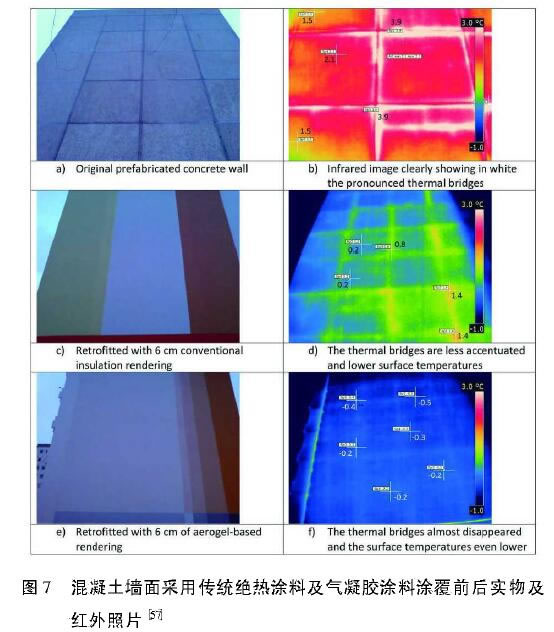 通過將顆粒狀的SiO2氣凝膠添加到水泥混凝土中,形成氣凝膠保溫砂漿與混凝土。成鎧等5制備了熱導(dǎo)率低至0.05 W/(m. K)、抗壓強度為0.52 MPa、線性收縮率為0.157%的氣凝膠保溫砂漿,各項技術(shù)指標(biāo)高于國標(biāo)要求。Wakili 等 將商業(yè)用氣凝膠砂漿用于德國某個1989年建造的30 m高建筑物的維修上,U值從傳統(tǒng)材料的1.0 W/(m2.K)降至0.3 W1(m2.K),而且氣凝膠砂漿涂覆后墻體縫隙處的熱橋消失(圖7),很好地起到了保溫絕熱的效果,同時實現(xiàn)了墻體透氣和防水,在惡劣條件下仍然具有很佳的應(yīng)用價值。法國的Ibrahim等159將SiO2氣凝膠作為砂漿填充層,并通過預(yù)筑成型、機器噴涂或人工砌筑等方式用于建筑墻面保溫,結(jié)果表明砂漿密度為200 kg/m3時,比熱容為1100 kJ/(kg. K),熱導(dǎo)率低至0.027 W/(m . K)。Ng等ba將體積分?jǐn)?shù)為50%的氣凝膠加入到高性能混凝土中,制備的氣凝膠混凝土抗壓強度為20MPa,熱導(dǎo)率為0.55 W/(m. K)。
